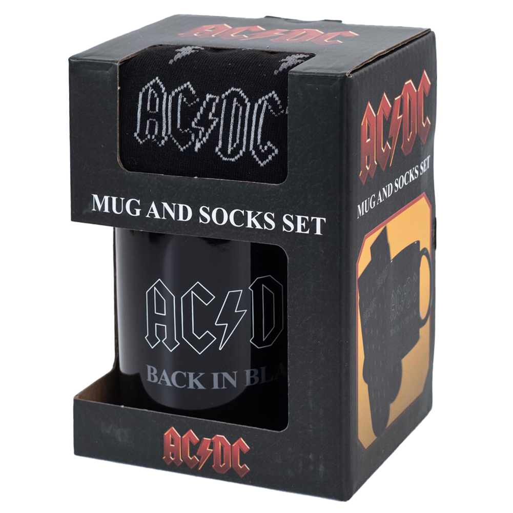 Black mug and socks both featuring the iconic “Back In Black” album design