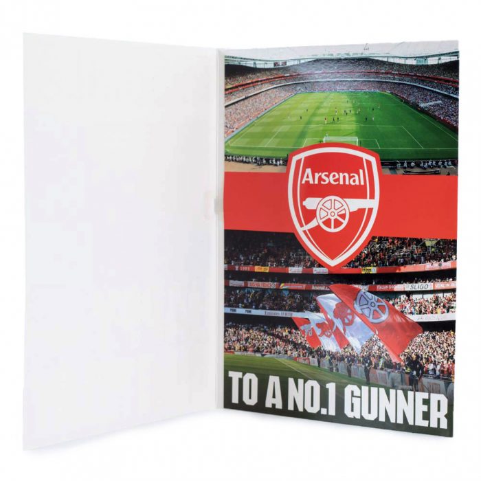 Vibrant red gloss finish birthday card with a large Arsenal crest