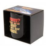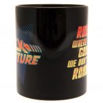 Featuring the logo and famous quote ‘Roads? Where we’re going we don’t need roads’ on a black mug