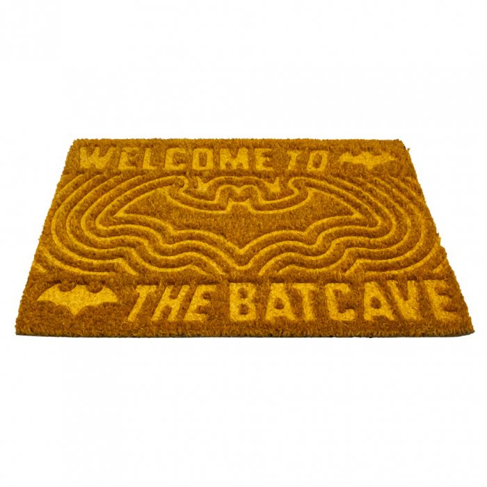 Natural colour coir doormat featuring several Batman logos and the text ‘Welcome to the Batcave’