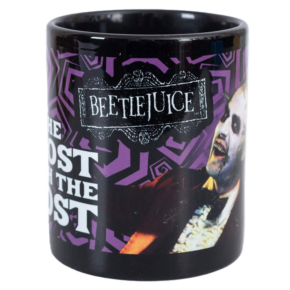 Black mug with an image of a smiling Beetlejuice and the text ‘THE GHOST WITH THE MOST’ around the mug