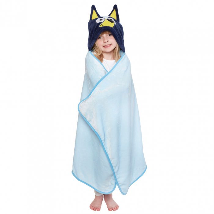 Baby blue hooded towel with Bluey’s smiley face on the hood including cosy hand pockets