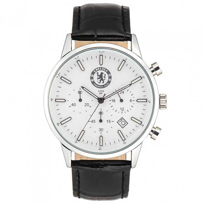Classic mens white watch with a silver casing and a genuine leather black strap