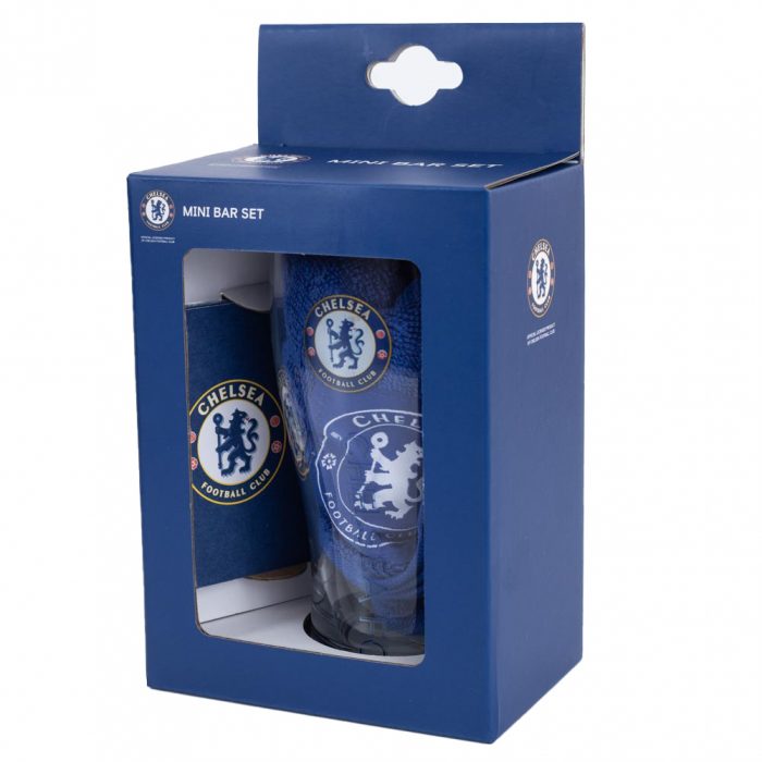 Mini bar set with tulip style pint glass featuring blue Chelsea FC text and full colour club crest