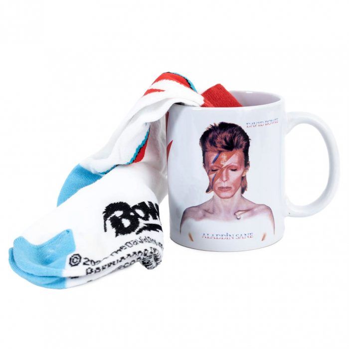 White mug and socks incorporating the iconic lightening strike design along with images from the Aladdin Sane album