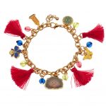 Gold colour fashion bracelet with four pink tassels and Encanto themed charms