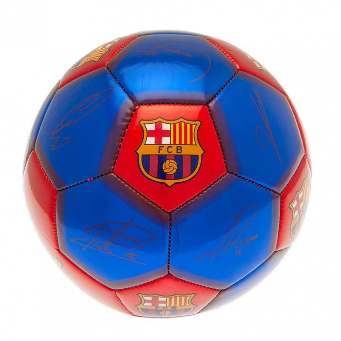 Striking FC Barcelona branding featuring the Barca crest plus official player signature prints