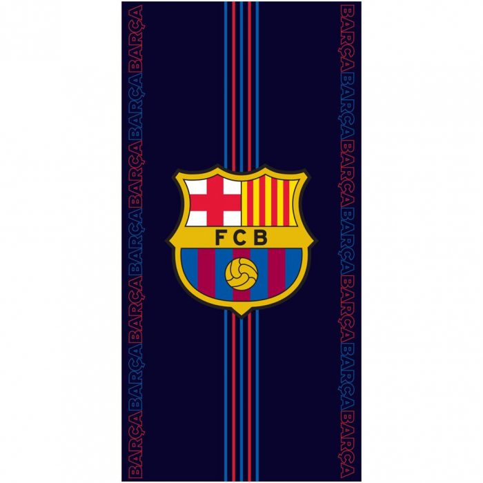 Featuring red & blue central stripes, Barca text repeat design and large FCB crest