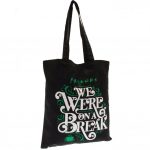 Black tote bag featuring a logo and the iconic phrase ‘We Were On A Break’