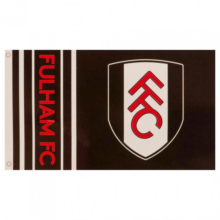 This black wordmark flag features a full colour Fulham FC crest, white stripe design and text