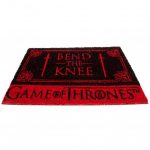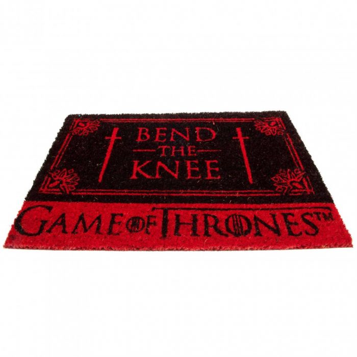 Black coir doormat featuring house Targaryen “Bend The Knee” design in red
