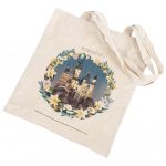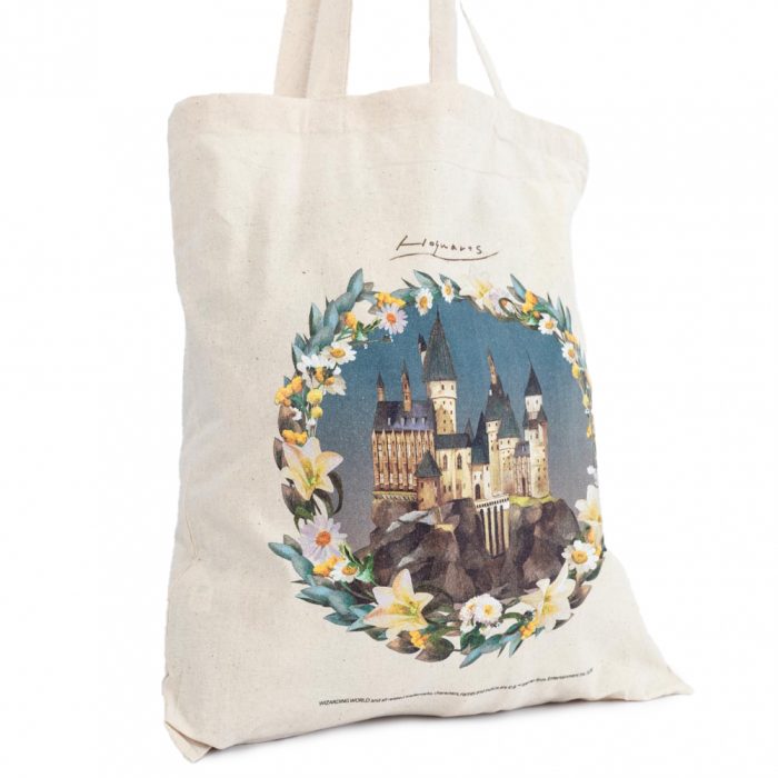 Cream tote bag featuring a picturesque image of Hogwarts surrounded by pretty flowers