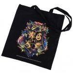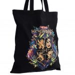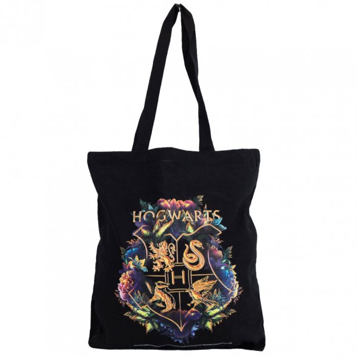Black canvas tote bag featuring a large gold printed Hogwarts crest surrounded by colourful flowers