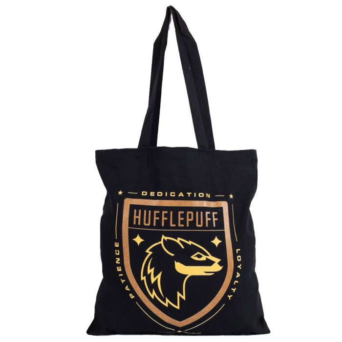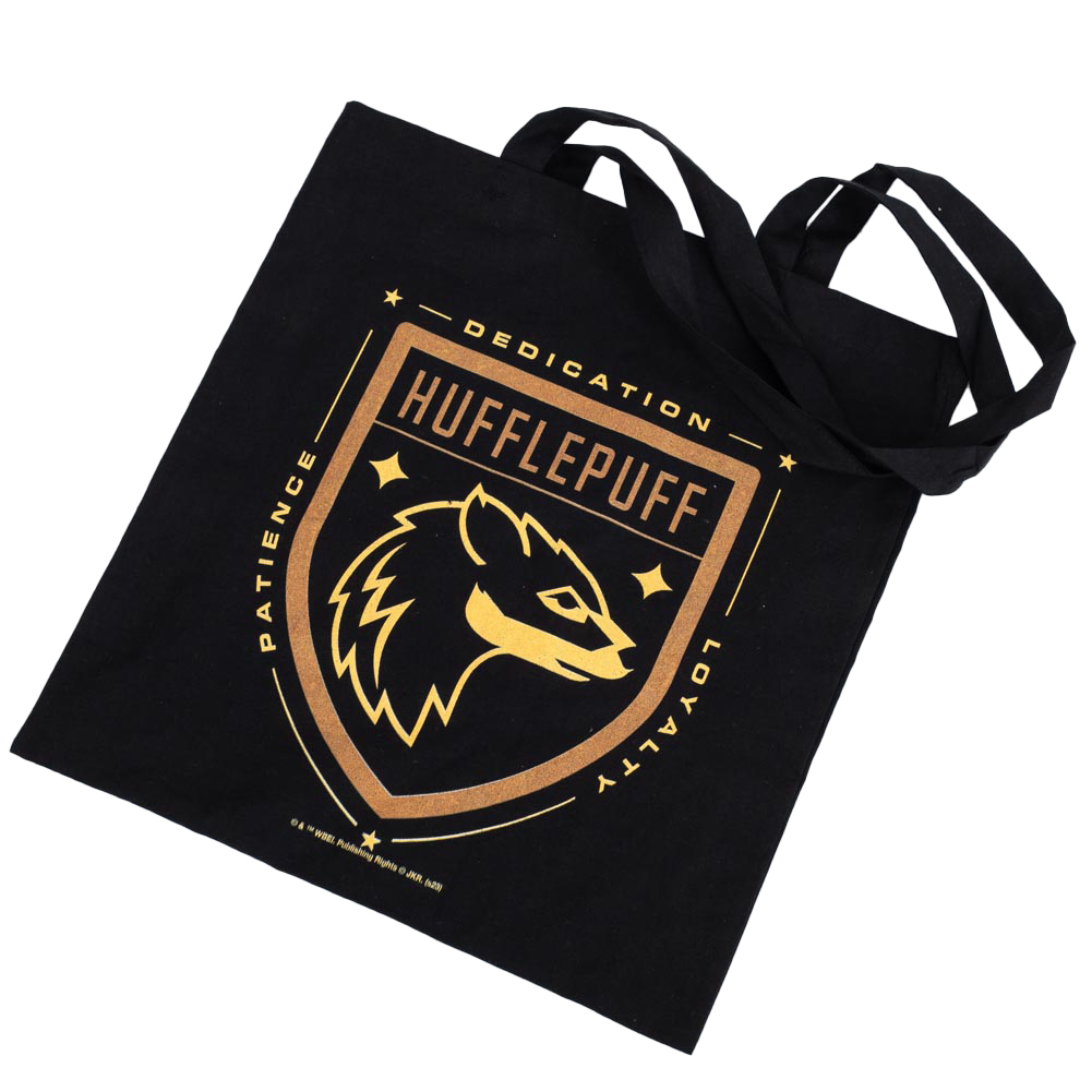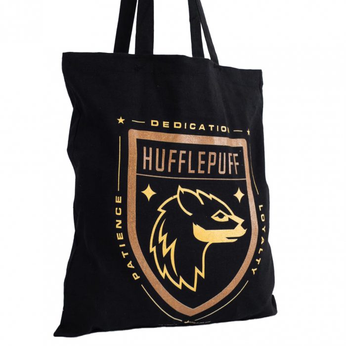 Black canvas tote bag featuring a large gold printed Hufflepuff crest to one side
