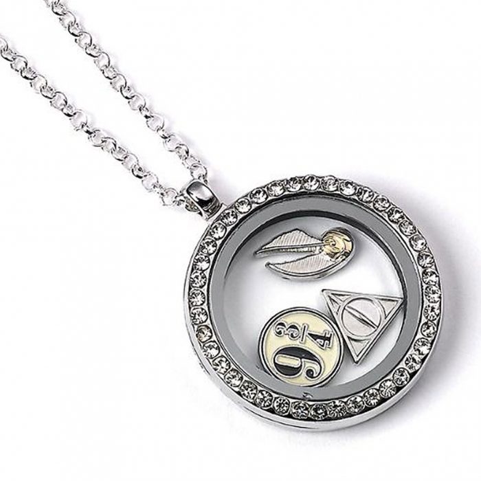 A window locket with floating 9 & 3 Quarters, Deathly Hallows and Golden Snitch charms