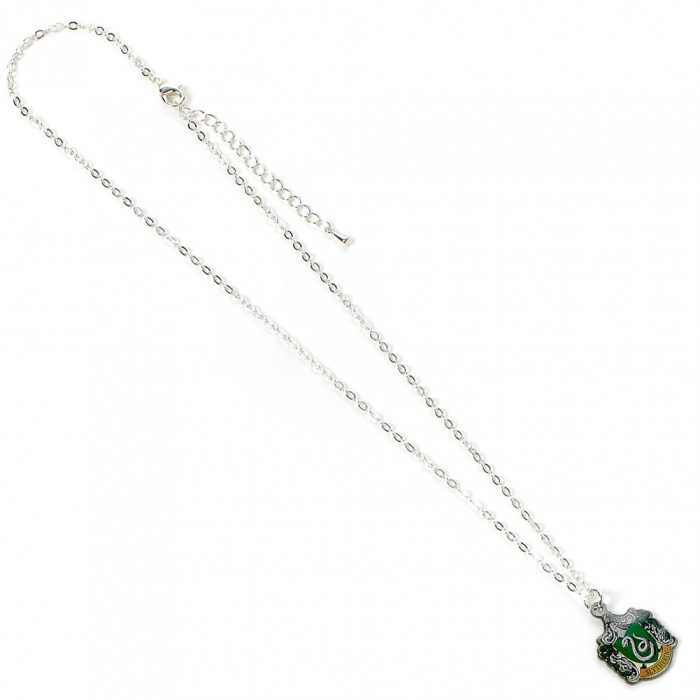 The Slytherin house crest charm on a silver plated necklace