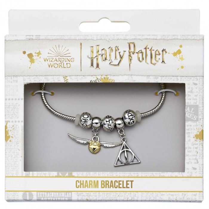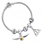 Harry Potter Deathly Hallows and Golden Snitch charms on a silver plated charm bracelet with three spellbeads