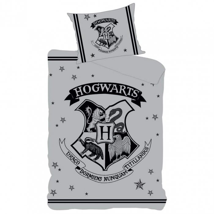 Grey quilt cover featuring a large Hogwarts crest and stars design in black