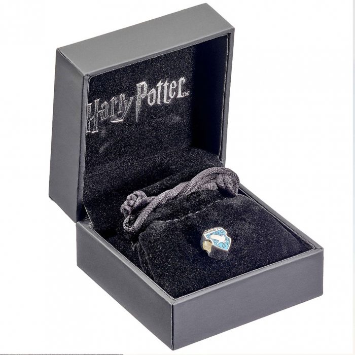 Featuring a silhouette of a Raven and infilled with enamel in Ravenclaw house colours