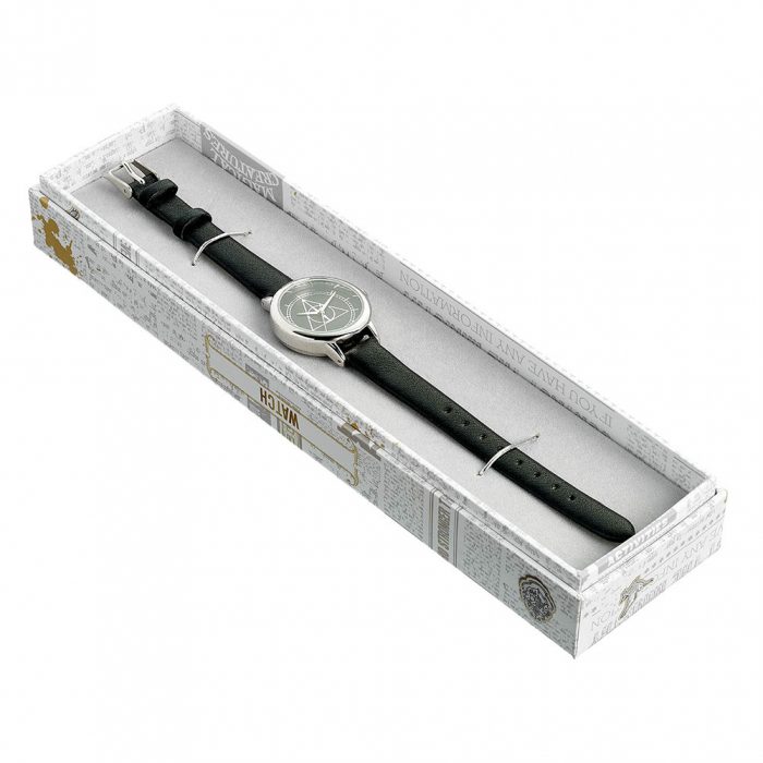 The dial features a silver plated surround with the iconic Deathly Hallows symbol