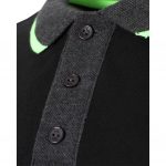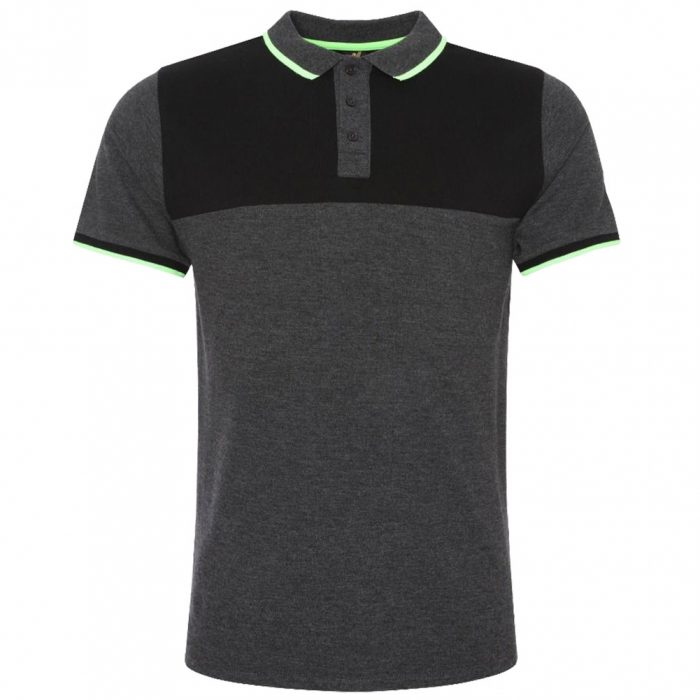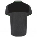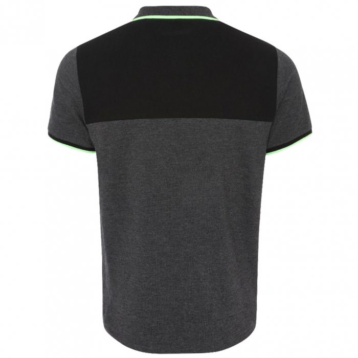 Mens charcoal short sleeve polo with black panelling and neon green trim