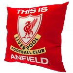 Vibrant red cushion featuring the retro LFC Liverbird crest and ‘This Is Anfield’ text