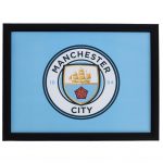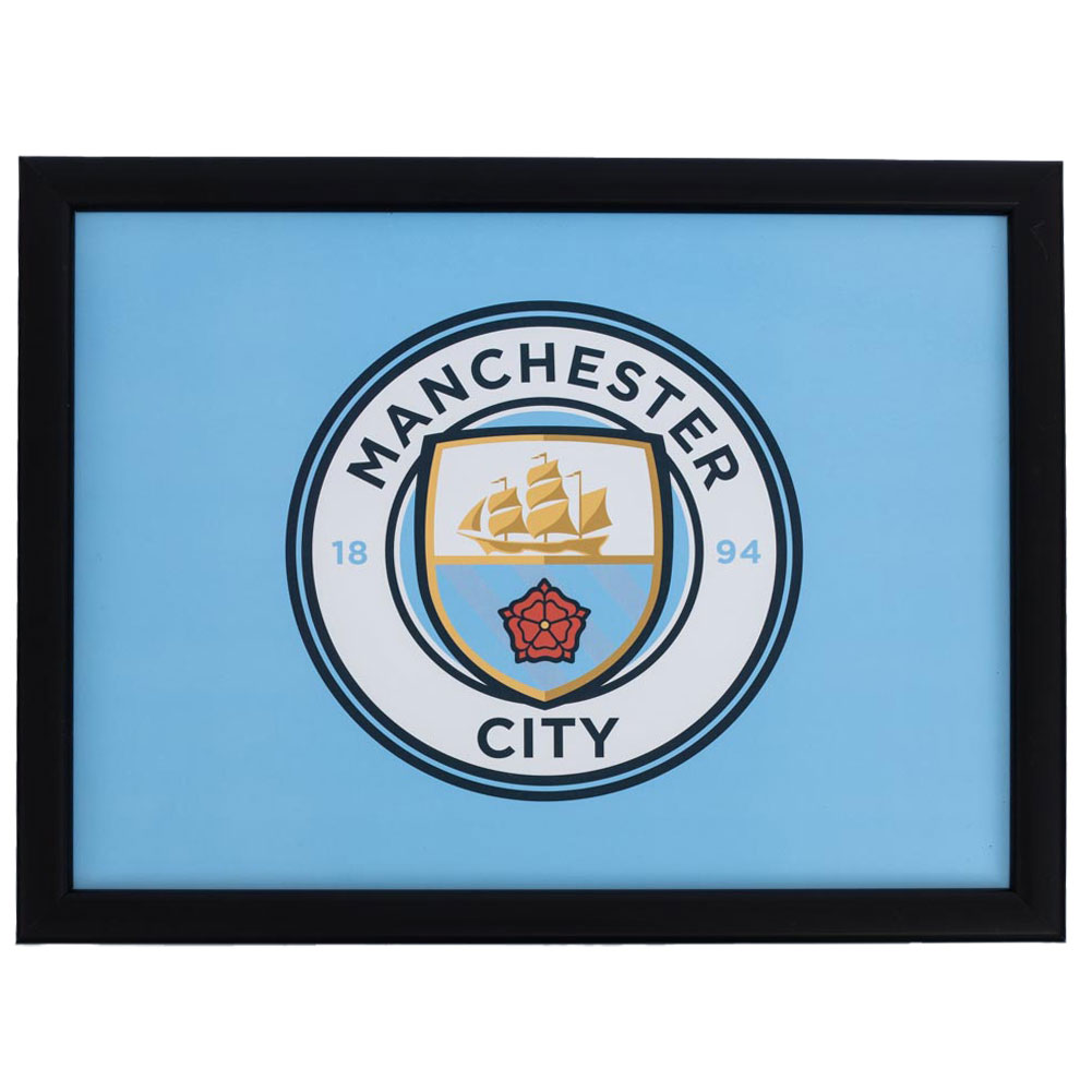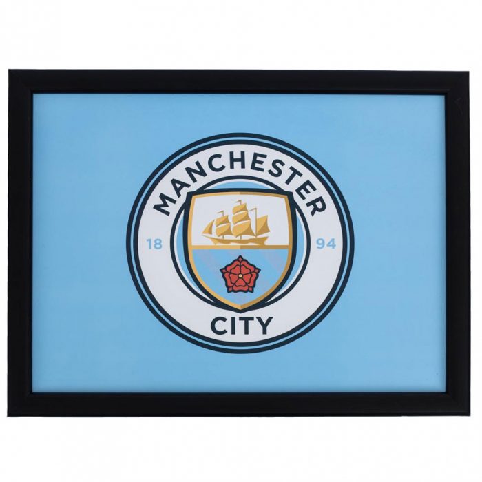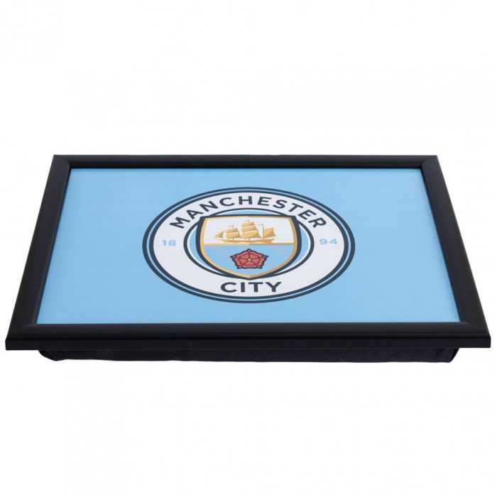 Featuring the Manchester City crest on a sky blue background