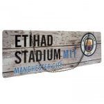 Featuring a large club crest and text on a wood panel effect background