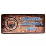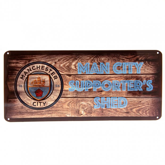 Featuring a large club crest and supporter’s shed text on a wood panel effect background