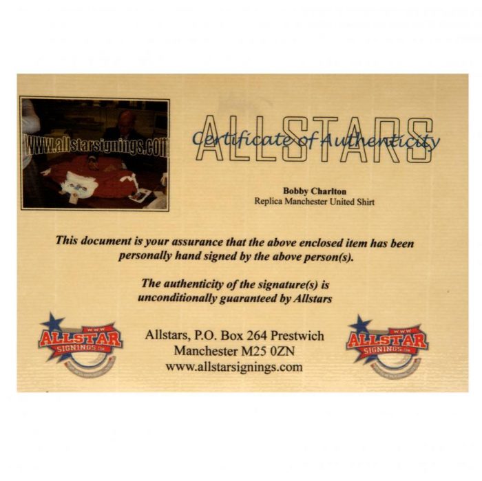 Hand signed on the front by Sir Bobby Charlton