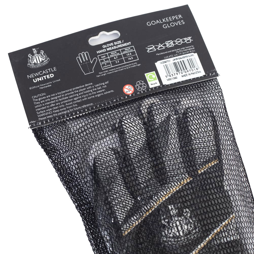 Black and white goalkeeper gloves featuring the Newcastle crest in white