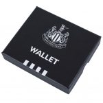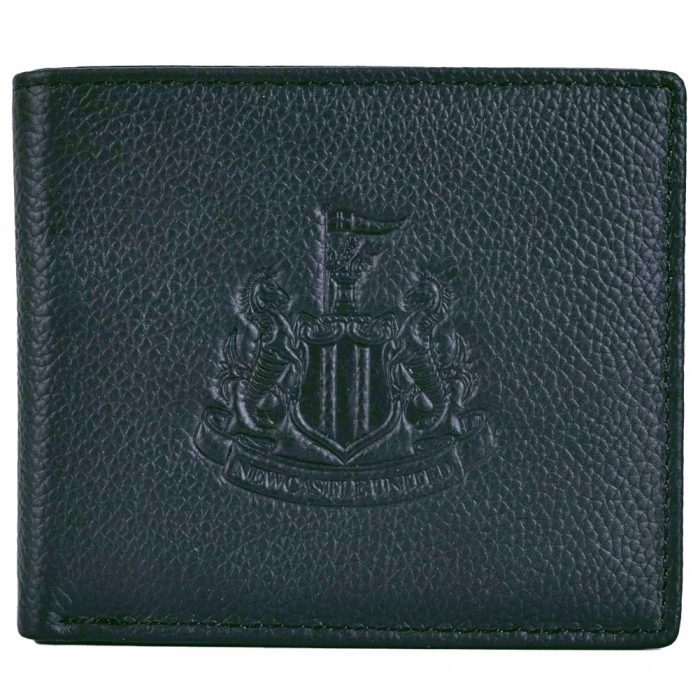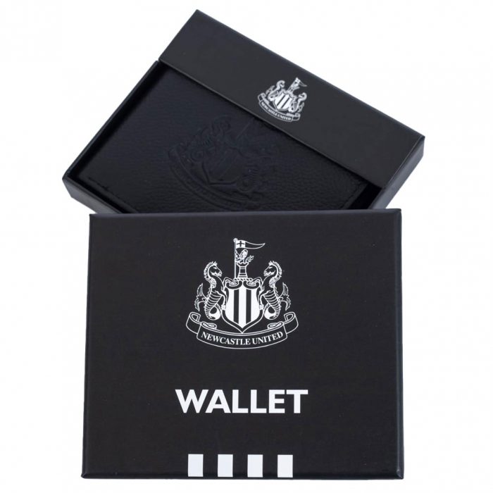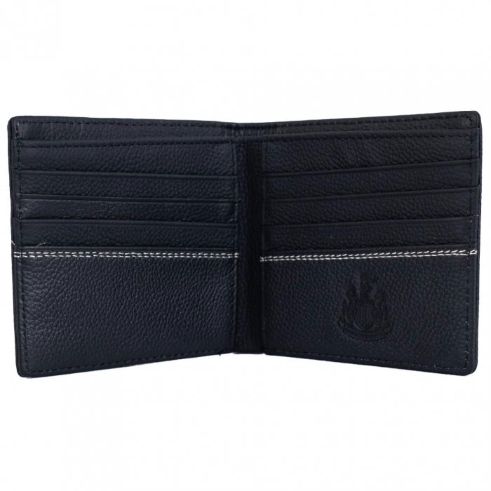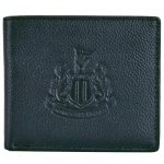 Black premium leather wallet with an embossed NUFC crest on the front and inside