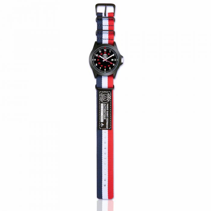 Mens analogue sports watch with a black face, white digits and glow in the dark hands
