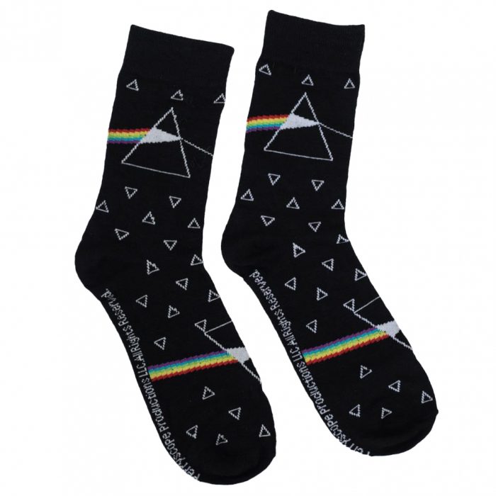 Black mug and socks featuring the iconic Dark Side of the Moon pyramid in two positions