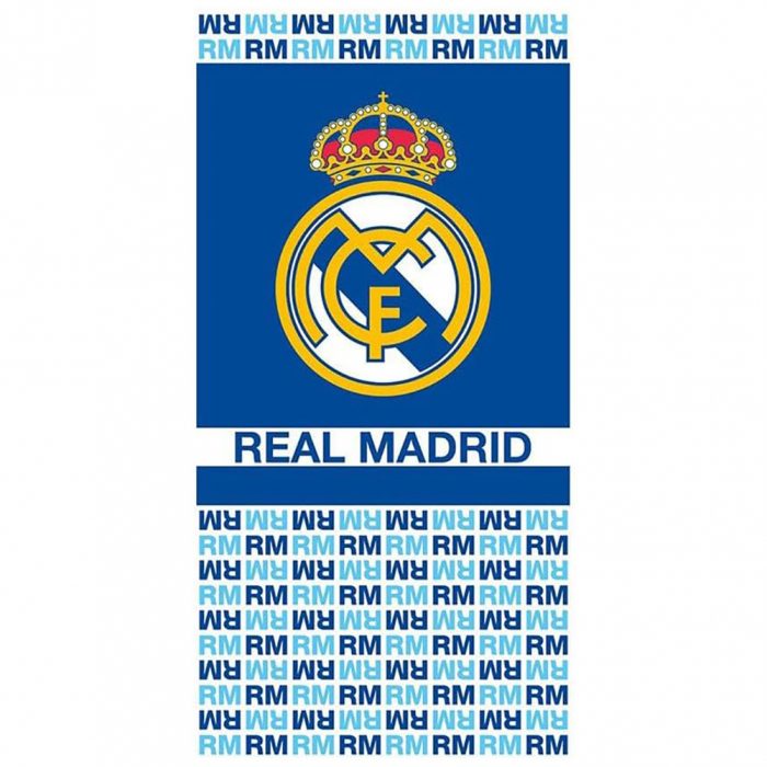 Blue towel featuring a large Real Madrid crest in the middle, with a repeat ‘RM’ pattern across the bottom