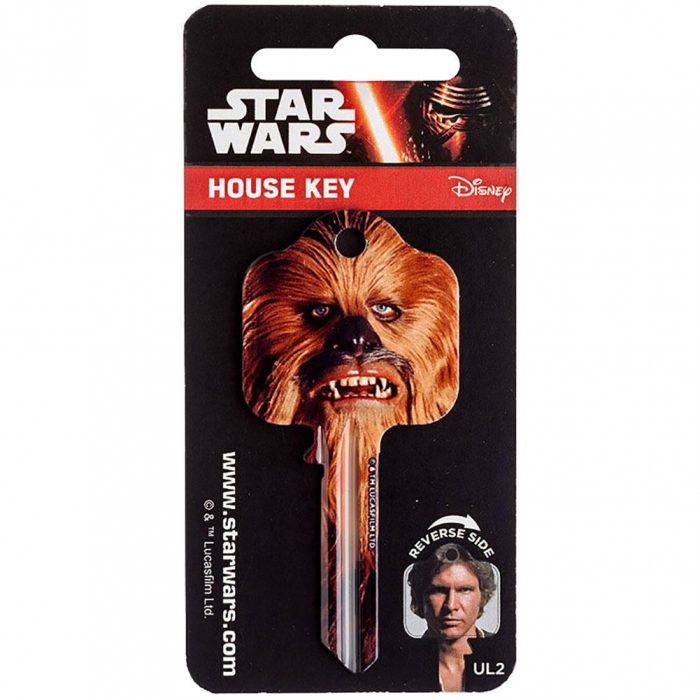 Ready to cut blank door key featuring Chewbacca and Han Solo