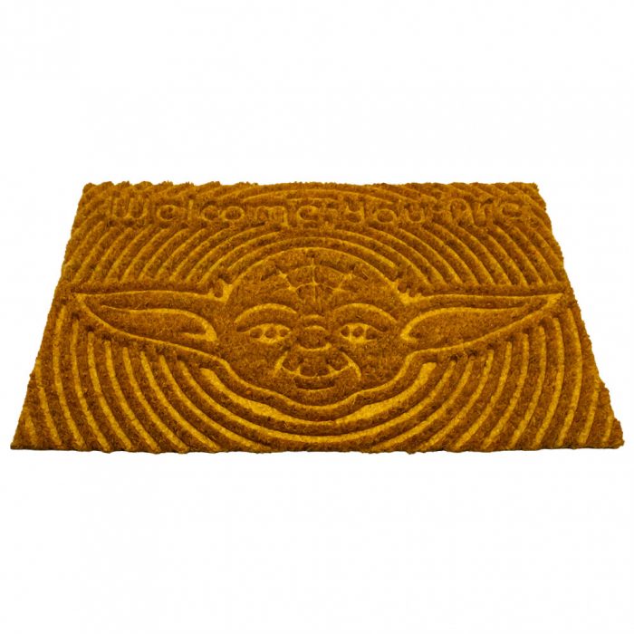 Natural colour coir doormat featuring the text ‘Welcome You Are’ with an image of Yoda across the middle