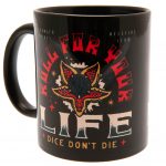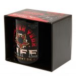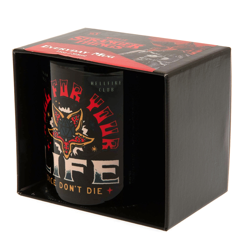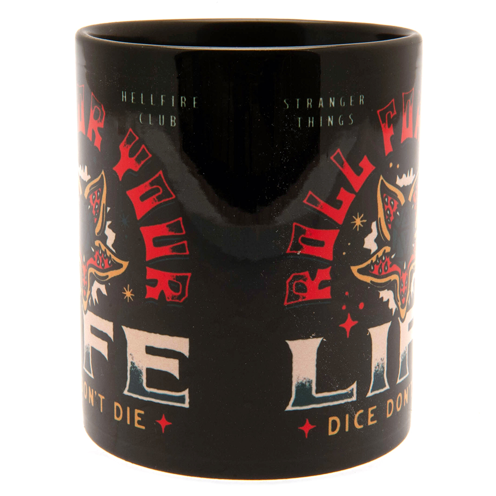 Black mug featuring at work of the Demogorgon and the text ‘Roll For Your Life, Dice Don’t Die’