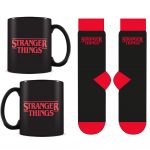 Black mug and socks featuring the Stranger Things logo