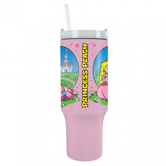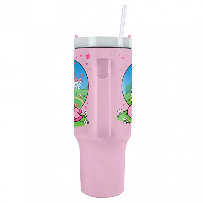 Pretty pink Princess Peach themed 40oz thermal mug, perfect for fans of the classic Nintendo franchise