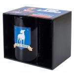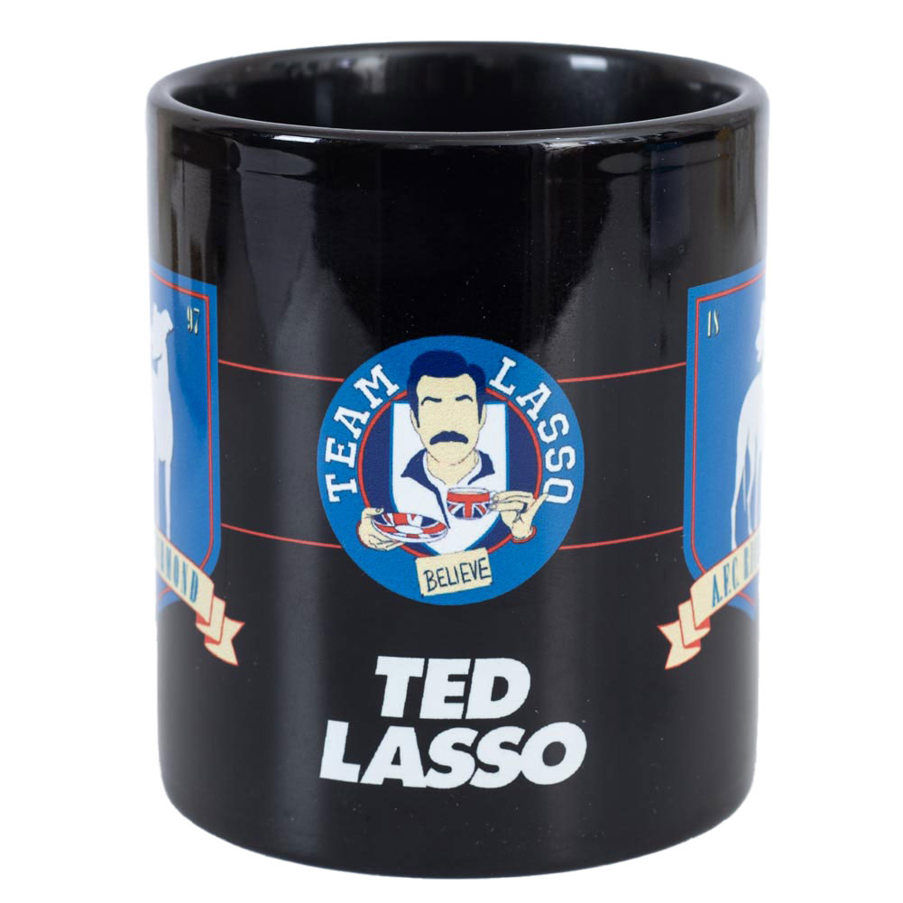 Black mug featuring a Team Lasso crest, along with two AFC Richmond crests