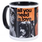 White mug with a black inner and orange features, including images of The Beatles singing the lyrics from ‘All you need is love’ around the mug