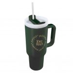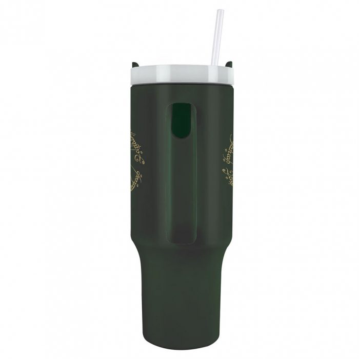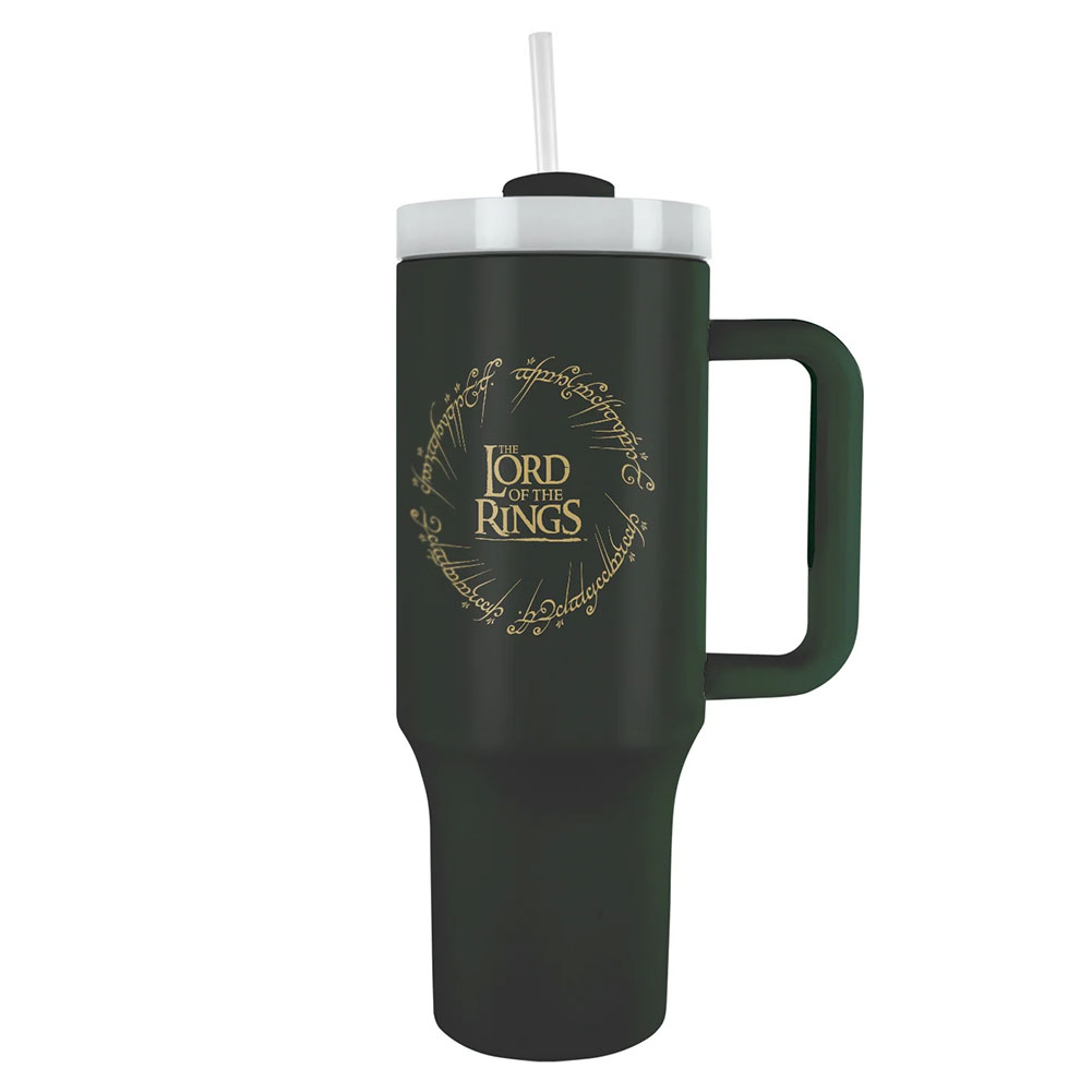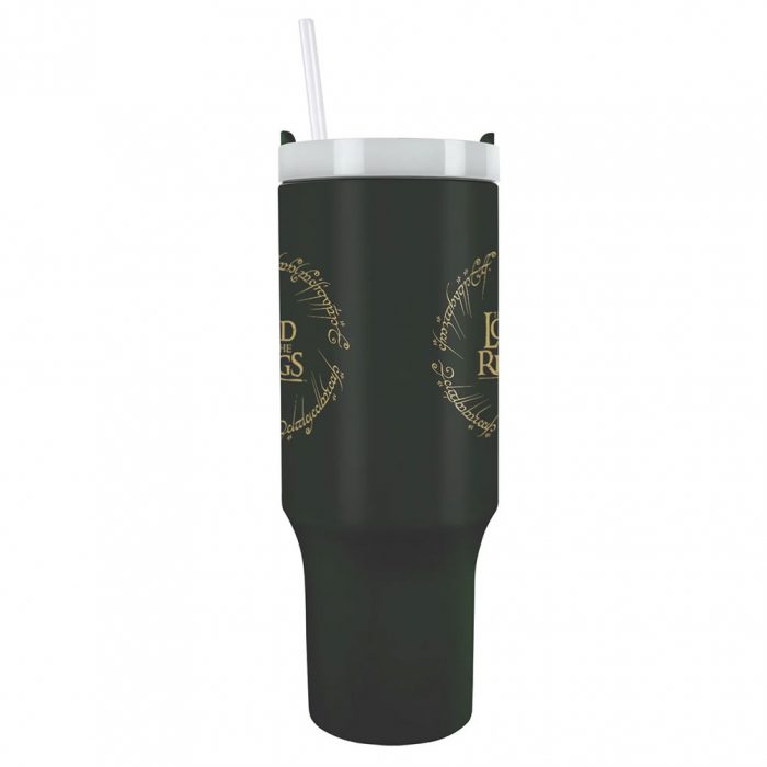Sleek black Lord of the Rings 40oz thermal tumbler with Elvish inscription, ideal for fans of all ages