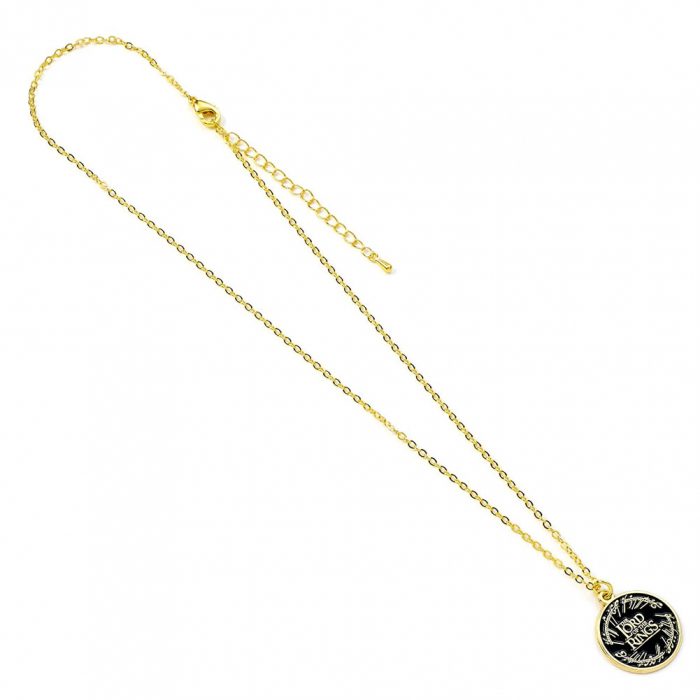 The Lord of the Rings title and elvish script on a gold plated necklace