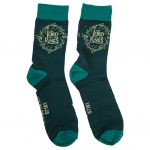 Dark green mug and socks showcasing the Lord of the Rings logo surrounded by Elvish script