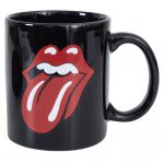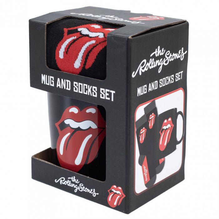 Black mug and socks featuring the famous tongue logo of the Rolling Stones rock group