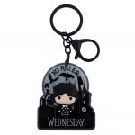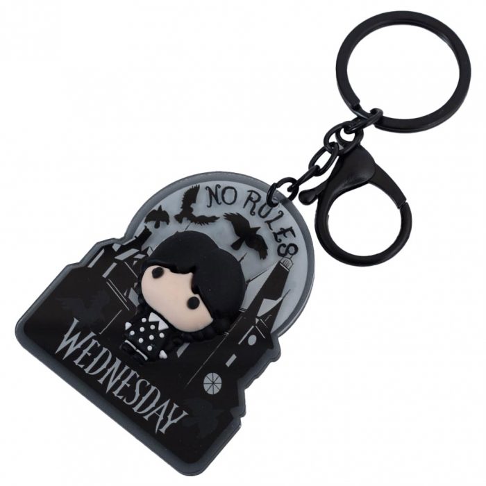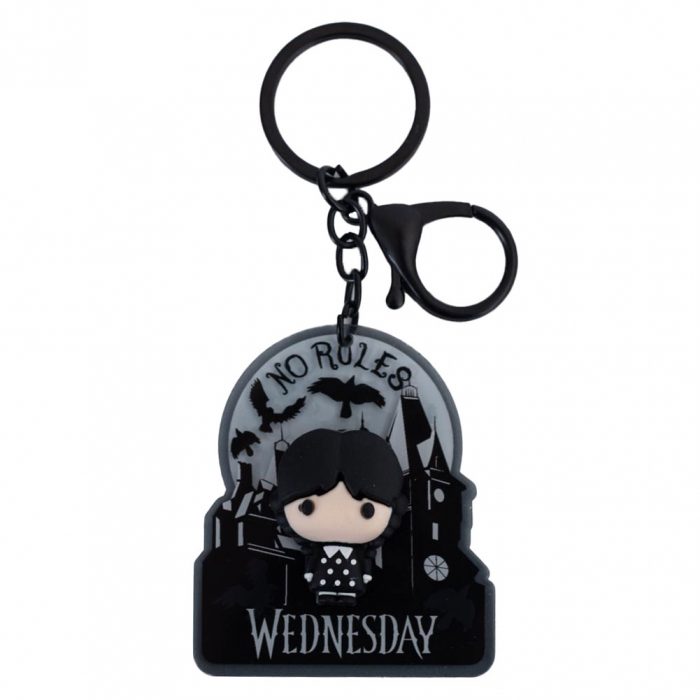 Keyring includes the text ‘No Rules’ along with Wednesday imagery in the background