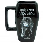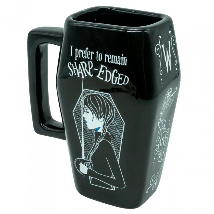 Black mug with a detailed 3D Wednesday design featuring a coffin and the words ‘I prefer to remain Sharp-Edged’