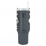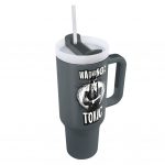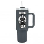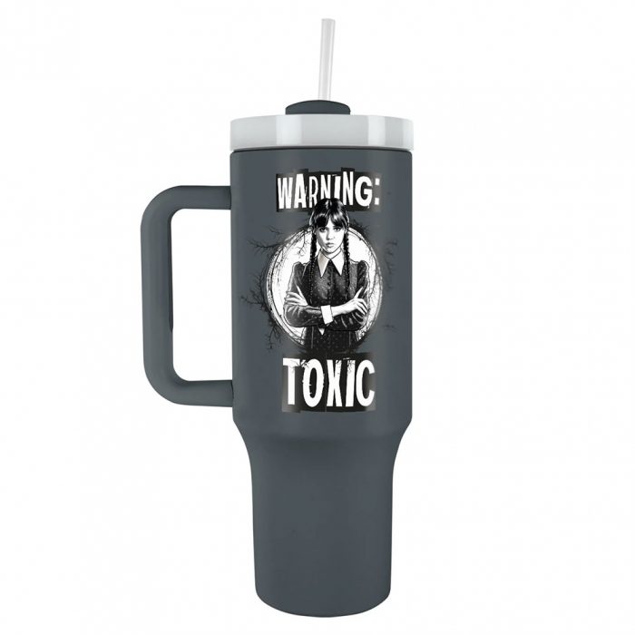 Charcoal grey Wednesday Addams themed 40oz thermal mug, with the text ‘WARNING: TOXIC’ in two positions
