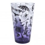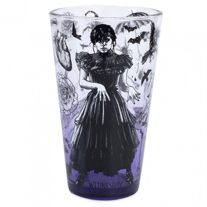 Featuring a large black and white print of Wednesday Addams on the front, with iconic images and phrases printed around the remainder of the glass in black
